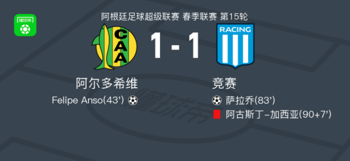 北京时间4月20日阿根廷足球超级联赛 春季联赛 第15轮,阿尔多希维主场对阵竞赛。阿尔多希维Felipe Anso破门。竞赛萨拉乔破门。最终比分阿尔多希维 11 竞赛。