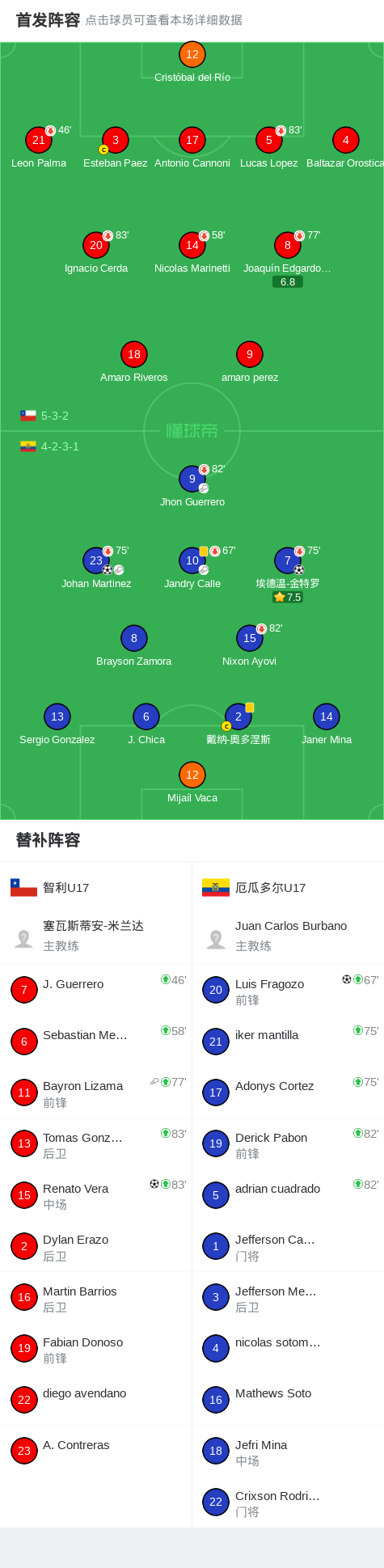 第74分钟,厄瓜多尔U17球员Johan Martinez助攻Luis Fragozo打入一球。