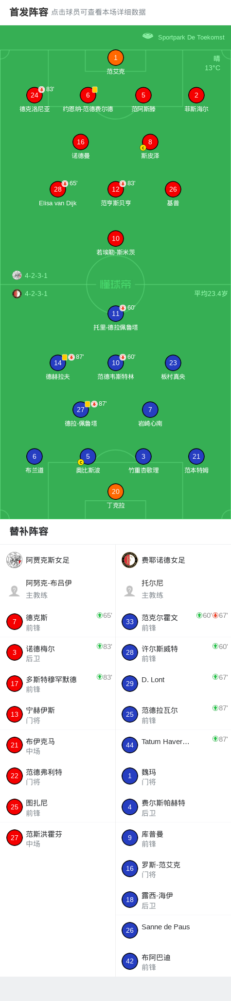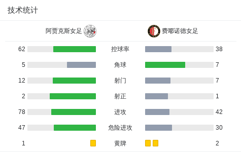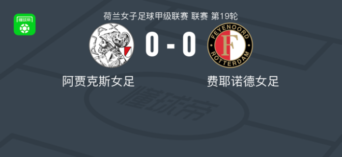 阿贾克斯女足0-0费耶诺德女足,秋色平分 足球资讯 发布时间: 2026年4月26日 阅读时间: 少于1 分钟 FacebookXPinterestWhatsApp 阿贾克斯女足0-0费耶诺德女足,秋色平分 北京时间4月26日荷兰女子足球甲级联赛 联赛 第19轮,阿贾克斯女足主场对阵费耶诺德女足。最终比分阿贾克斯女足 0–0 费耶诺德女足。 点击查看本场比赛详细数据>> 球队阵容 技术统计 FacebookXPinterestWhatsApp 1823100https://1823100.com 红单推荐 021 西甲 奥萨苏纳vs塞维利亚 红单推荐 2026年4月26日 013 英足总杯 切尔西(中)vs利兹联 红单推荐 2026年4月26日 023 英超 阿森纳vs纽卡斯尔 红单推荐 2026年4月25日 016 英超 狼队vs热刺 红单推荐 2026年4月25日 013 英超 桑德兰vs诺丁汉 红单推荐 2026年4月24日 热门资讯 003 欧冠 利物浦vs巴黎圣日耳曼 红单推荐 2026年4月14日 三人20+!火箭21分逆转太阳7连胜 KD24分阿门22+11+8 篮球资讯 2026年4月8日 008 意甲 国米vs卡利亚里 红单推荐 2026年4月17日 约基奇第198次三双!掘金大胜灰熊豪取10连胜 穆雷26+7+5 篮球资讯 2026年4月9日 009 朗斯vs图卢兹 红单推荐 2026年4月17日
