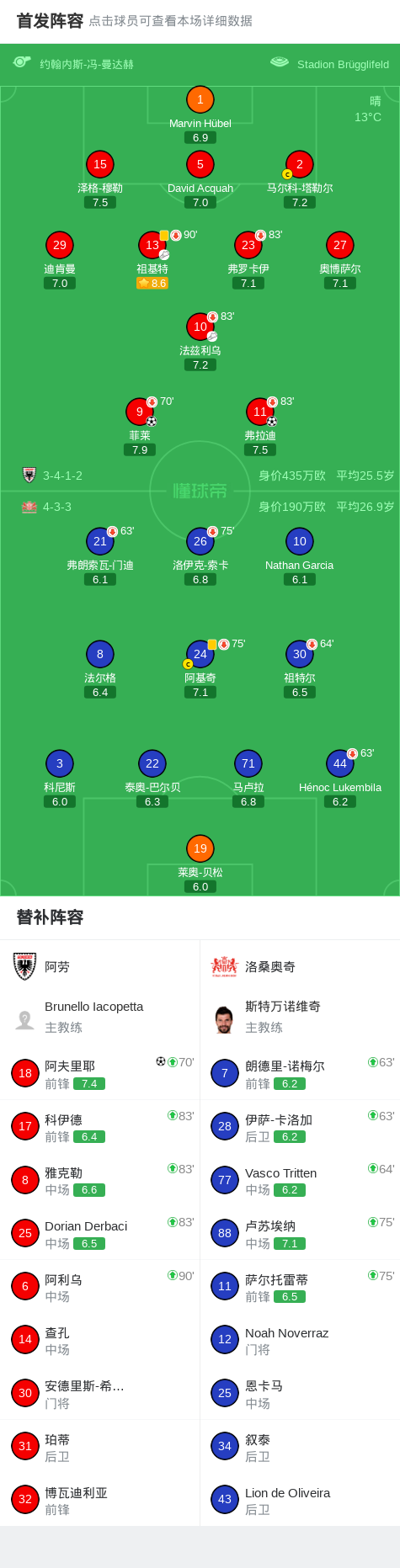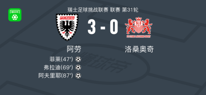 阿劳3-0大胜洛桑奥奇,阿夫里耶、弗拉迪破门 足球资讯 发布时间: 2026年4月23日 阅读时间: 少于1 分钟 FacebookXPinterestWhatsApp 阿劳3-0大胜洛桑奥奇,阿夫里耶、弗拉迪破门 北京时间4月23日瑞士足球挑战联赛 联赛 第31轮,阿劳主场对阵洛桑奥奇。阿劳菲莱破门,弗拉迪破门,阿夫里耶破门。最终比分阿劳 3–0 洛桑奥奇。 点击查看本场比赛详细数据>> 精彩瞬间 第47分钟,阿劳球员菲莱打入一球。 第69分钟,阿劳球员法兹利乌助攻弗拉迪打入一球。 第87分钟,阿劳球员祖基特助攻阿夫里耶打入一球。 球队阵容 技术统计 FacebookXPinterestWhatsApp 1823100https://1823100.com 红单推荐 015 西甲 巴萨vs塞尔塔 红单推荐 2026年4月22日 012 英超 伯恩茅斯vs利兹联 红单推荐 2026年4月22日 007 意杯 国际米兰vs科莫 红单推荐 2026年4月21日 005 西甲 毕尔巴鄂竞技vs奥萨苏纳 红单推荐 2026年4月21日 001 意甲 莱切vs佛罗伦萨 红单推荐 2026年4月20日 热门资讯 萨拉戈萨U19 0-0乌德山U19,双方握手言和 足球资讯 2026年4月12日 克莱普尔1-0巴拉卡斯体育,Aaron Caraballo一锤定音 足球资讯 2026年4月13日 007 英冠 伊普斯维奇vs米德尔斯堡 红单推荐 2026年4月19日 萨拉赫安菲尔德英超进108球,联赛历史单座球场进球仅次于亨利 足球资讯 2026年4月12日 萨拉赫英超打入157粒非点球进球,追平阿圭罗列历史第五 足球资讯 2026年4月12日