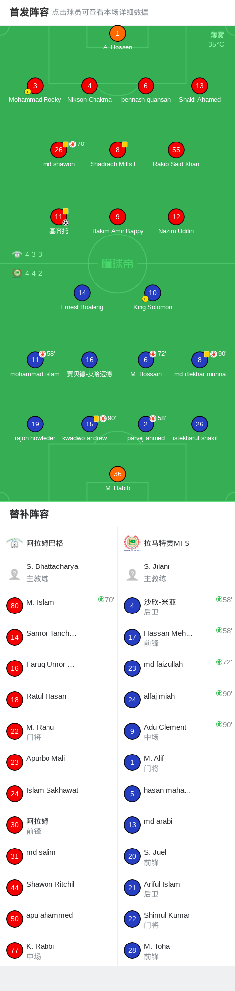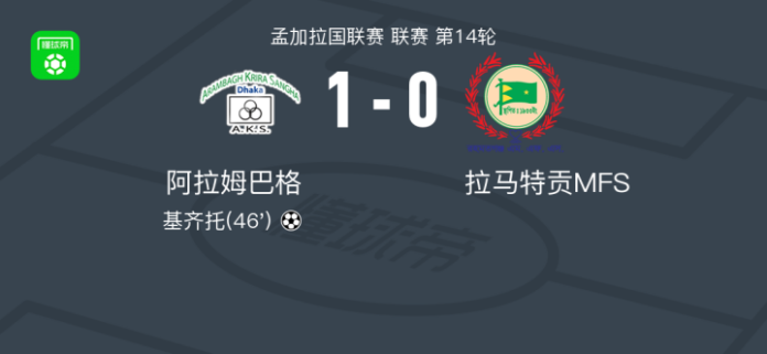 阿拉姆巴格1-0拉马特贡MFS,基齐托一击制胜 足球资讯 发布时间: 2026年4月24日 阅读时间: 少于1 分钟 FacebookXPinterestWhatsApp 阿拉姆巴格1-0拉马特贡MFS,基齐托一击制胜 北京时间4月24日孟加拉国联赛 联赛 第14轮,阿拉姆巴格主场对阵拉马特贡MFS。阿拉姆巴格基齐托破门。最终比分阿拉姆巴格 1–0 拉马特贡MFS。 点击查看本场比赛详细数据>> 精彩瞬间 第46分钟,阿拉姆巴格球员基齐托打入一球。 球队阵容 技术统计 FacebookXPinterestWhatsApp 1823100https://1823100.com 红单推荐 013 英超 桑德兰vs诺丁汉 红单推荐 2026年4月24日 014 西甲 贝蒂斯vs皇马 红单推荐 2026年4月24日 005 西甲 巴列卡诺vs西班牙人 红单推荐 2026年4月23日 003 西甲 莱万特vs塞维利亚 红单推荐 2026年4月23日 015 西甲 巴萨vs塞尔塔 红单推荐 2026年4月22日 热门资讯 约基奇第198次三双!掘金大胜灰熊豪取10连胜 穆雷26+7+5 篮球资讯 2026年4月9日 三人20+!火箭21分逆转太阳7连胜 KD24分阿门22+11+8 篮球资讯 2026年4月8日 002 欧协联 巴列卡诺vs雅典AEK 红单推荐 2026年4月9日 萨拉戈萨U19 0-0乌德山U19,双方握手言和 足球资讯 2026年4月12日 004 欧冠 巴萨vs马竞 红单推荐 2026年4月8日