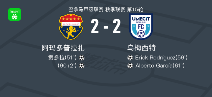 北京时间4月26日巴拿马甲级联赛 秋季联赛 第15轮,阿玛多普拉扎主场对阵乌梅西特。阿玛多普拉扎贡多拉破门。乌梅西特Erick Rodríguez破门,Alberto García破门。最终比分阿玛多普拉扎 2–2 乌梅西特。