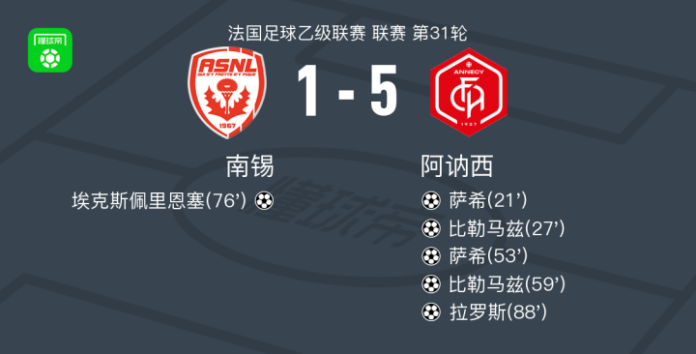北京时间4月18日法国足球乙级联赛 联赛 第31轮,南锡主场对阵阿讷西。南锡埃克斯佩里恩塞破门。阿讷西萨希梅开二度,比勒马兹梅开二度,拉罗斯破门。最终比分南锡 1–5 阿讷西。
