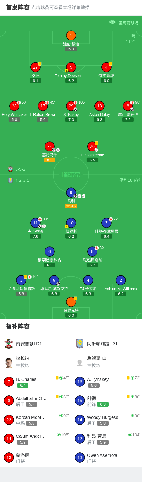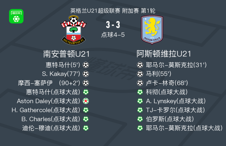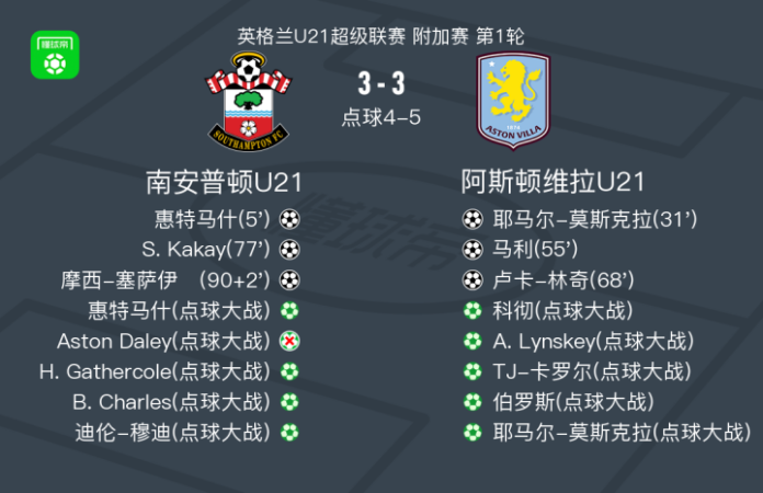 北京时间4月25日英格兰U21超级联赛 附加赛 第1轮,南安普顿U21主场对阵阿斯顿维拉U21。南安普顿U21惠特马什破门,S. Kakay破门,摩西-塞萨伊破门。阿斯顿维拉U21耶马尔-莫斯克拉破门,马利破门,卢卡-林奇破门。最终比分南安普顿U21 7–8 阿斯顿维拉U21。