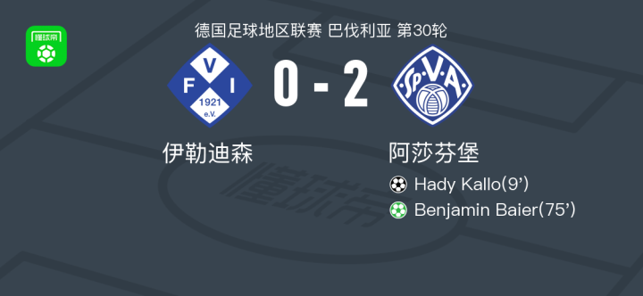北京时间4月22日德国足球地区联赛 巴伐利亚 第30轮,伊勒迪森主场对阵阿莎芬堡。阿莎芬堡Hady Kallo破门,Benjamin Baier破门。最终比分伊勒迪森 0–2 阿莎芬堡。