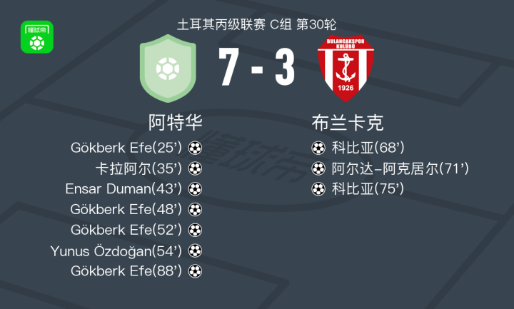 阿特华7-3大胜布兰卡克,Gökberk Efe大四喜,Yunus Özdoğan建功