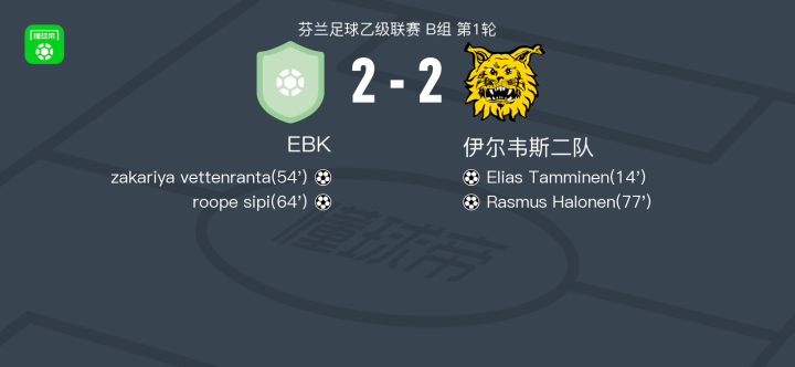 北京时间4月18日芬兰足球乙级联赛 B组 第1轮,EBK主场对阵伊尔韦斯二队。EBKzakariya vettenranta破门,roope sipi破门。伊尔韦斯二队Elias Tamminen破门,Rasmus Halonen破门。最终比分EBK 22 伊尔韦斯二队。