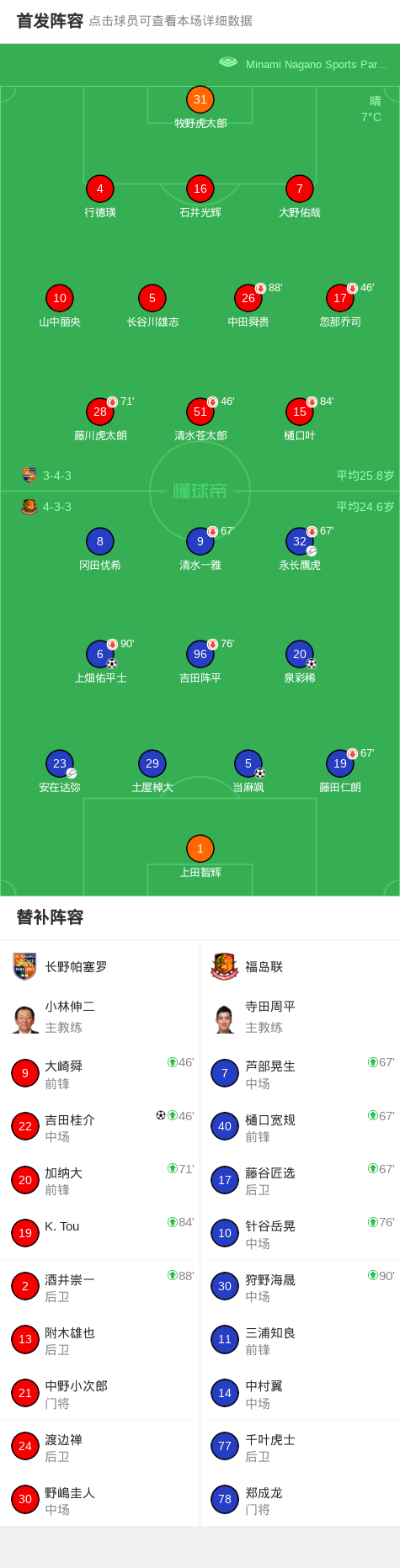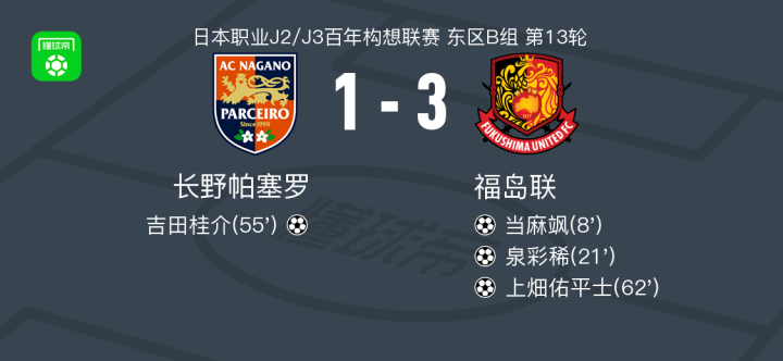 北京时间4月29日日本职业J2/J3百年构想联赛 东区B组 第13轮,长野帕塞罗主场对阵福岛联。长野帕塞罗吉田桂介破门。福岛联当麻飒破门,泉彩稀破门,上畑佑平士破门。最终比分长野帕塞罗 1–3 福岛联。