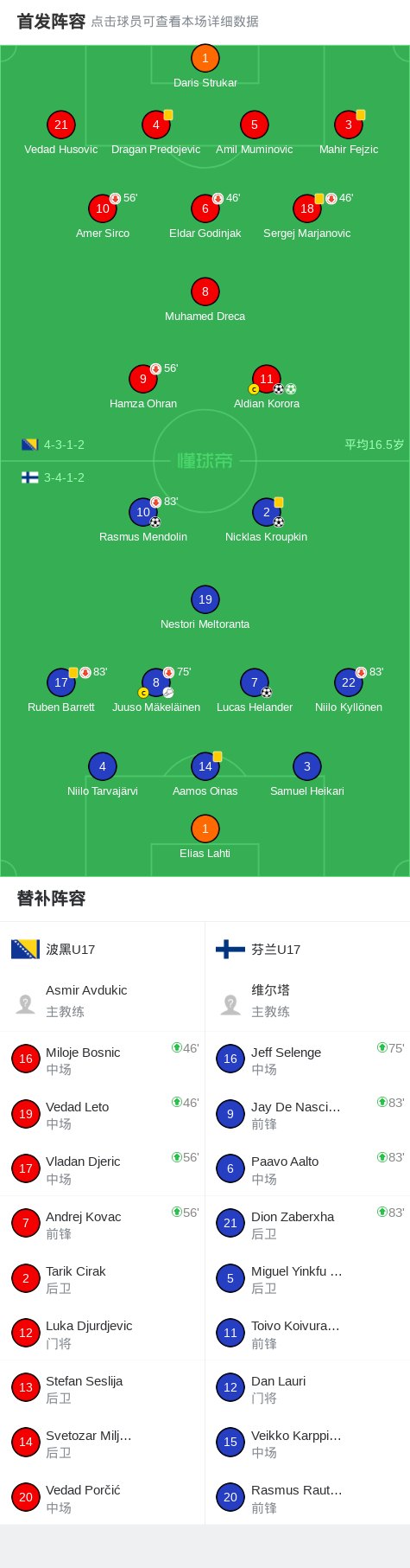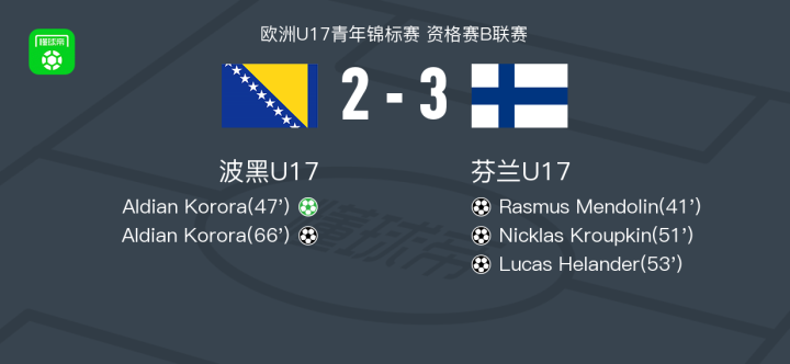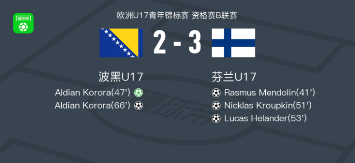 北京时间4月29日欧洲U17青年锦标赛 资格赛B联赛,波黑U17对阵芬兰U17。波黑U17Aldian Korora梅开二度。芬兰U17Rasmus Mendolin破门,Nicklas Kroupkin破门,Lucas Helander破门。最终比分波黑U17 2–3 芬兰U17。
