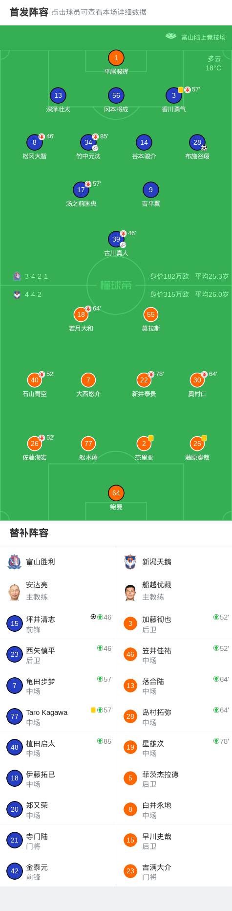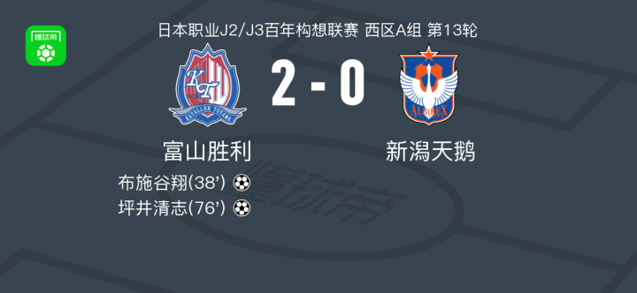 北京时间4月29日日本职业J2/J3百年构想联赛 西区A组 第13轮,富山胜利主场对阵新潟天鹅。富山胜利布施谷翔破门,坪井清志破门。最终比分富山胜利 2–0 新潟天鹅。