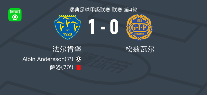 北京时间4月25日瑞典足球甲级联赛 联赛 第4轮,法尔肯堡主场对阵松兹瓦尔。法尔肯堡Albin Andersson破门。最终比分法尔肯堡 1–0 松兹瓦尔。