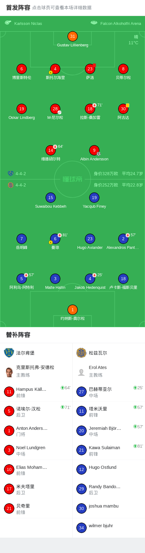 法尔肯堡1-0松兹瓦尔,Albin Andersson助球队取胜
