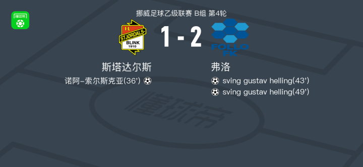 北京时间4月25日挪威足球乙级联赛 B组 第4轮,斯塔达尔斯主场对阵弗洛。斯塔达尔斯诺阿-索尔斯克亚破门。弗洛sving gustav helling梅开二度。最终比分斯塔达尔斯 1–2 弗洛。