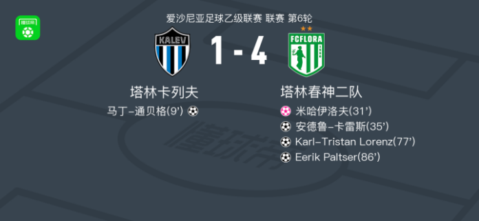 北京时间4月17日爱沙尼亚足球乙级联赛 联赛 第6轮,塔林卡列夫主场对阵塔林春神二队。塔林卡列夫马丁-通贝格破门,米哈伊洛夫自摆乌龙。塔林春神二队安德鲁-卡雷斯破门,Karl-Tristan Lorenz破门,Eerik Paltser破门。最终比分塔林卡列夫 1–4 弗洛拉B队。