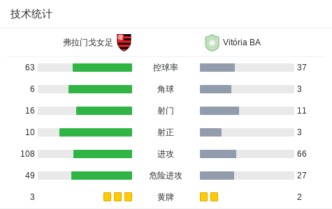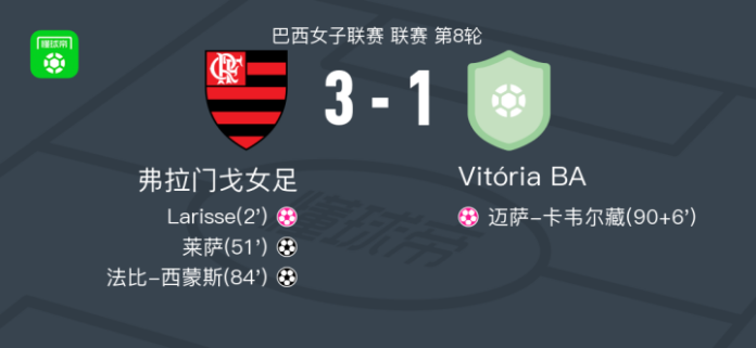 北京时间4月26日巴西女子联赛 联赛 第8轮,弗拉门戈女足主场对阵Vitória BA。弗拉门戈女足莱萨破门,法比-西蒙斯破门,迈萨-卡韦尔藏自摆乌龙。Vitória BALarisse自摆乌龙。最终比分弗拉门戈女足 31 Vitória BA。