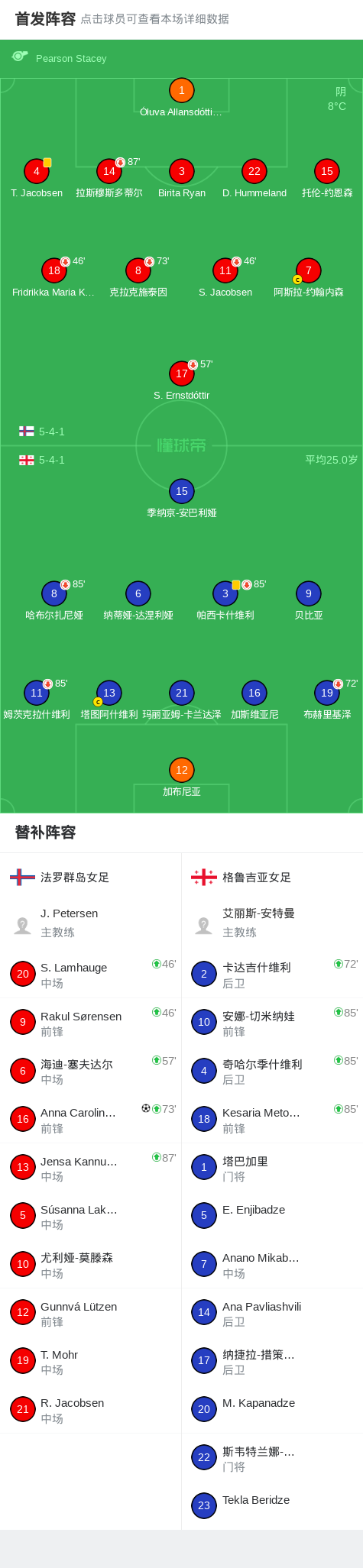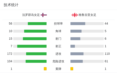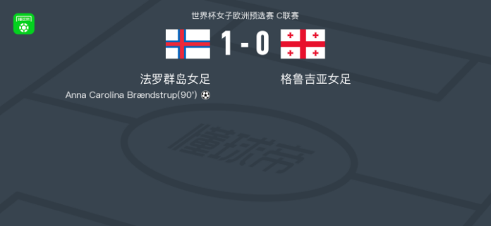 北京时间4月19日世界杯女子欧洲预选赛 C联赛,法罗群岛女足对阵格鲁吉亚女足。法罗群岛女足Anna Carolina Brændstrup破门。最终比分法罗群岛女足 1–0 格鲁吉亚女足。