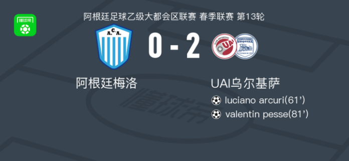 北京时间4月26日阿根廷足球乙级大都会区联赛 春季联赛 第13轮,阿根廷梅洛主场对阵UAI乌尔基萨。UAI乌尔基萨luciano arcuri破门,valentin pesse破门。最终比分阿根廷梅洛 02 费罗卡里。