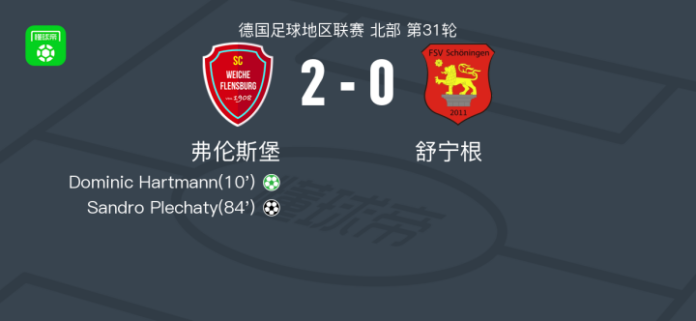 北京时间4月25日德国足球地区联赛 北部 第31轮,弗伦斯堡主场对阵舒宁根。弗伦斯堡Dominic Hartmann破门,Sandro Plechaty破门。最终比分弗伦斯堡 2–0 舒宁根。