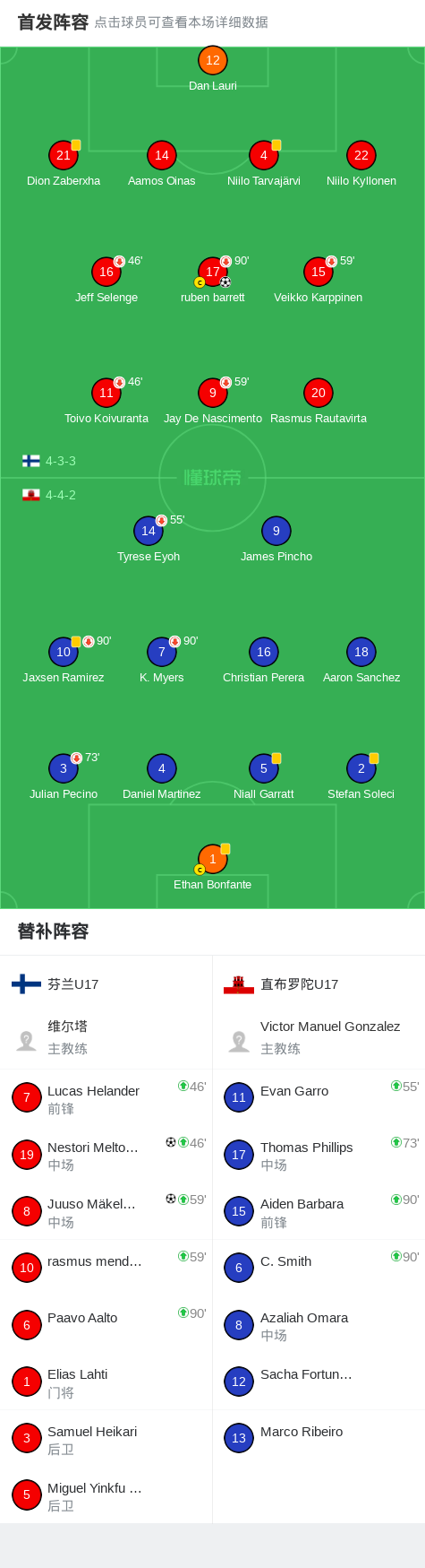 北京时间4月23日欧洲U17青年锦标赛 资格赛B联赛,芬兰U17对阵直布罗陀U17。芬兰U17Nestori Meltoranta破门,ruben barrett破门,Juuso Mäkeläinen破门。最终比分芬兰U17 30 直布罗陀U17。