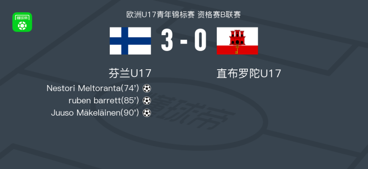 芬兰U17 3-0大胜直布罗陀U17,Juuso Mäkeläinen建功,ruben barrett破门