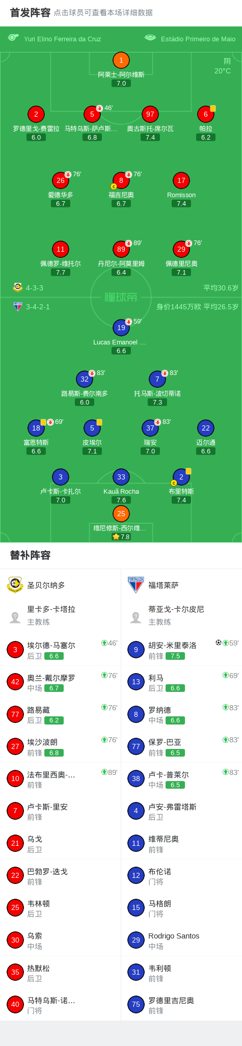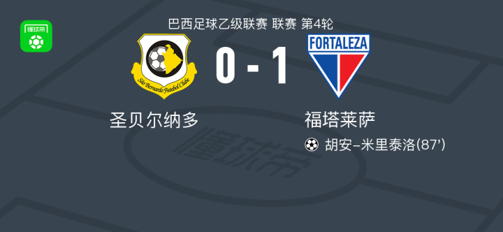 福塔莱萨1-0圣贝尔纳多,胡安-米里泰洛绝杀 足球资讯 发布时间: 2026年4月13日 阅读时间: 少于1 分钟 FacebookXPinterestWhatsApp 福塔莱萨1-0圣贝尔纳多,胡安-米里泰洛绝杀 北京时间4月13日巴西足球乙级联赛 联赛 第4轮,圣贝尔纳多主场对阵福塔莱萨。福塔莱萨胡安-米里泰洛破门。最终比分圣贝尔纳多 0–1 福塔莱萨。 点击查看本场比赛详细数据>> 点击查看巴乙完整积分榜>> 精彩瞬间 第87分钟,福塔莱萨球员胡安-米里泰洛打入一球。 球队阵容 技术统计 FacebookXPinterestWhatsApp 1823100https://1823100.com 红单推荐 015 西甲 巴萨vs塞尔塔 红单推荐 2026年4月22日 012 英超 伯恩茅斯vs利兹联 红单推荐 2026年4月22日 007 意杯 国际米兰vs科莫 红单推荐 2026年4月21日 005 西甲 毕尔巴鄂竞技vs奥萨苏纳 红单推荐 2026年4月21日 001 意甲 莱切vs佛罗伦萨 红单推荐 2026年4月20日 热门资讯 005 英超 曼联vs利兹联 红单推荐 2026年4月13日 004 欧冠 巴萨vs马竞 红单推荐 2026年4月8日 三人20+!火箭21分逆转太阳7连胜 KD24分阿门22+11+8 篮球资讯 2026年4月8日 007 意杯 国际米兰vs科莫 红单推荐 2026年4月21日 023 英超 利物浦vs富勒姆 红单推荐 2026年4月11日