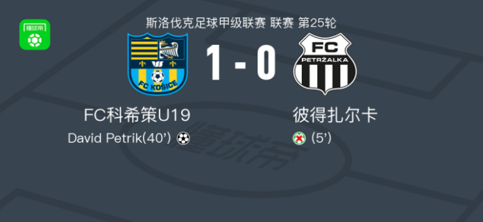 北京时间4月19日斯洛伐克足球甲级联赛 联赛 第25轮,FC科希策U19主场对阵彼得扎尔卡。FC科希策U19David Petrik破门。最终比分FC科希策U19 10 彼得扎尔卡。