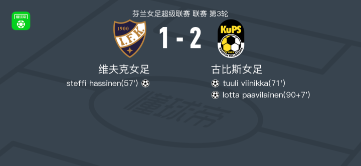 北京时间4月25日芬兰女足超级联赛 联赛 第3轮,维夫克女足主场对阵古比斯女足。维夫克女足steffi hassinen破门。古比斯女足tuuli viinikka破门,lotta paavilainen破门。最终比分维夫克女足 1–2 古比斯女足。