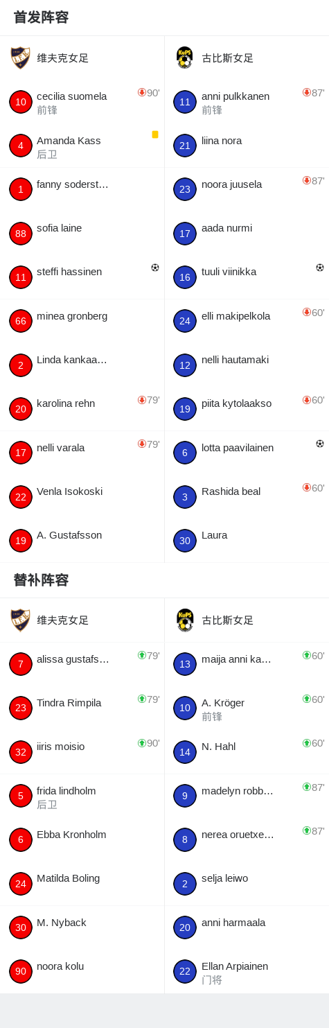 古比斯女足2-1逆转维夫克女足,lotta paavilainen、tuuli viinikka破门