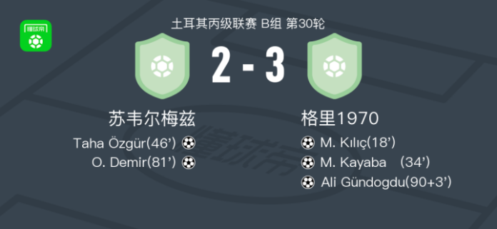 北京时间4月18日土耳其丙级联赛 B组 第30轮,苏韦尔梅兹主场对阵格里1970。苏韦尔梅兹Taha Özgür破门,O. Demir破门。格里1970M. Kılıç破门,M. Kayabaş破门,Ali Gündogdu破门。最终比分苏韦尔梅兹 2–3 格里1970。