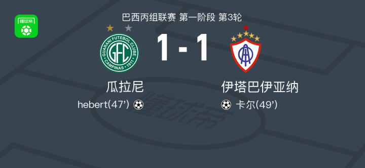 瓜拉尼1-1伊塔巴伊亚纳,hebert先拔头筹,卡尔扳平 足球资讯 发布时间: 2026年4月20日 阅读时间: 少于1 分钟 FacebookXPinterestWhatsApp 瓜拉尼1-1伊塔巴伊亚纳,hebert先拔头筹,卡尔扳平 北京时间4月20日巴西丙组联赛 第一阶段 第3轮,瓜拉尼主场对阵伊塔巴伊亚纳。瓜拉尼hebert破门。伊塔巴伊亚纳卡尔破门。最终比分瓜拉尼 1–1 伊塔巴伊亚纳。 点击查看本场比赛详细数据>> 点击查看巴丙完整积分榜>> 精彩瞬间 第47分钟,瓜拉尼球员hebert打入一球。 第49分钟,伊塔巴伊亚纳球员卡尔打入一球。 球队阵容 技术统计 FacebookXPinterestWhatsApp 1823100https://1823100.com 红单推荐 013 英超 桑德兰vs诺丁汉 红单推荐 2026年4月24日 014 西甲 贝蒂斯vs皇马 红单推荐 2026年4月24日 005 西甲 巴列卡诺vs西班牙人 红单推荐 2026年4月23日 003 西甲 莱万特vs塞维利亚 红单推荐 2026年4月23日 015 西甲 巴萨vs塞尔塔 红单推荐 2026年4月22日 热门资讯 约基奇第198次三双!掘金大胜灰熊豪取10连胜 穆雷26+7+5 篮球资讯 2026年4月9日 三人20+!火箭21分逆转太阳7连胜 KD24分阿门22+11+8 篮球资讯 2026年4月8日 002 欧协联 巴列卡诺vs雅典AEK 红单推荐 2026年4月9日 萨拉戈萨U19 0-0乌德山U19,双方握手言和 足球资讯 2026年4月12日 004 欧冠 巴萨vs马竞 红单推荐 2026年4月8日