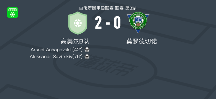 北京时间4月20日白俄罗斯甲级联赛 联赛 第3轮,高美尔B队主场对阵莫罗德切诺。高美尔B队Arseni Achapovski 破门,Aleksandr Savitskiy破门。最终比分高美尔B队 2–0 莫罗德切诺。
