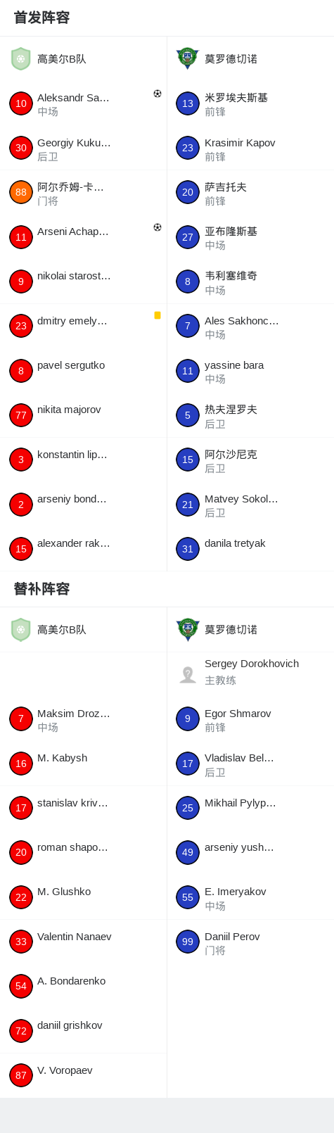 高美尔B队2-0莫罗德切诺,Arseni Achapovski 建功,Aleksandr Savitskiy锁定胜局