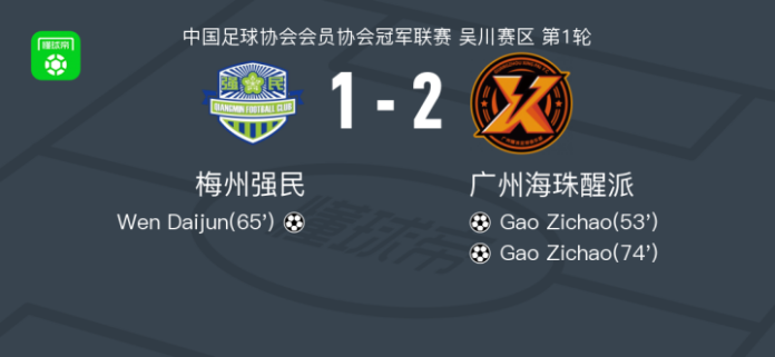 北京时间4月21日中国足球协会会员协会冠军联赛 吴川赛区 第1轮,梅州强民主场对阵广州海珠醒派。梅州强民Wen Daijun破门。广州海珠醒派Gao Zichao梅开二度。最终比分梅州强民 1–2 广州海珠醒派。