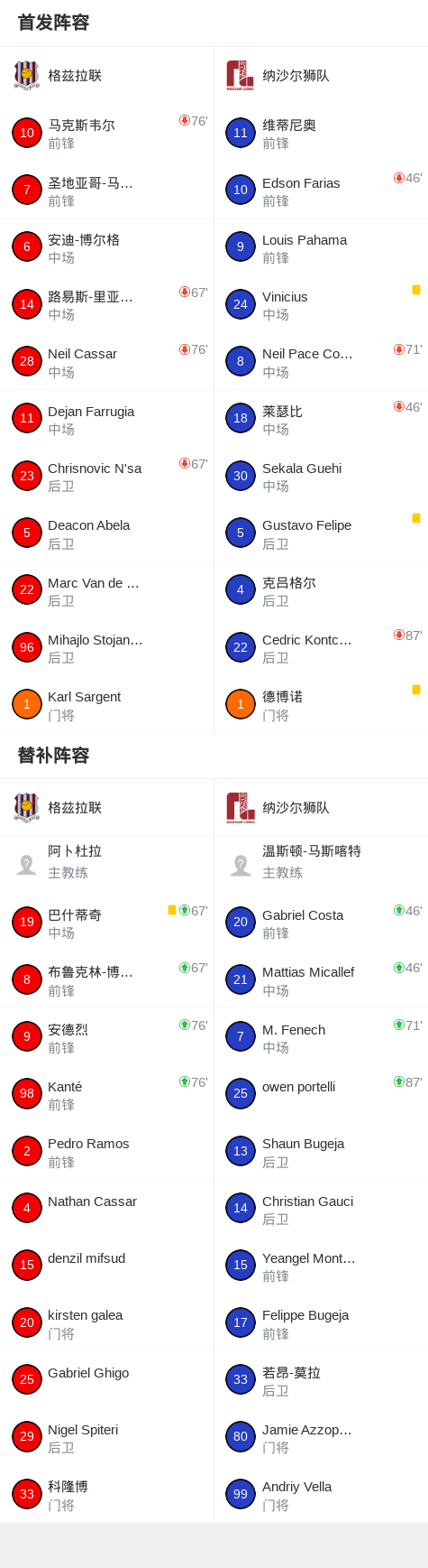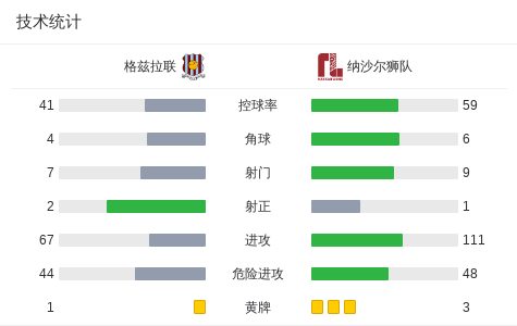 格兹拉联0-0纳沙尔狮队,秋色平分