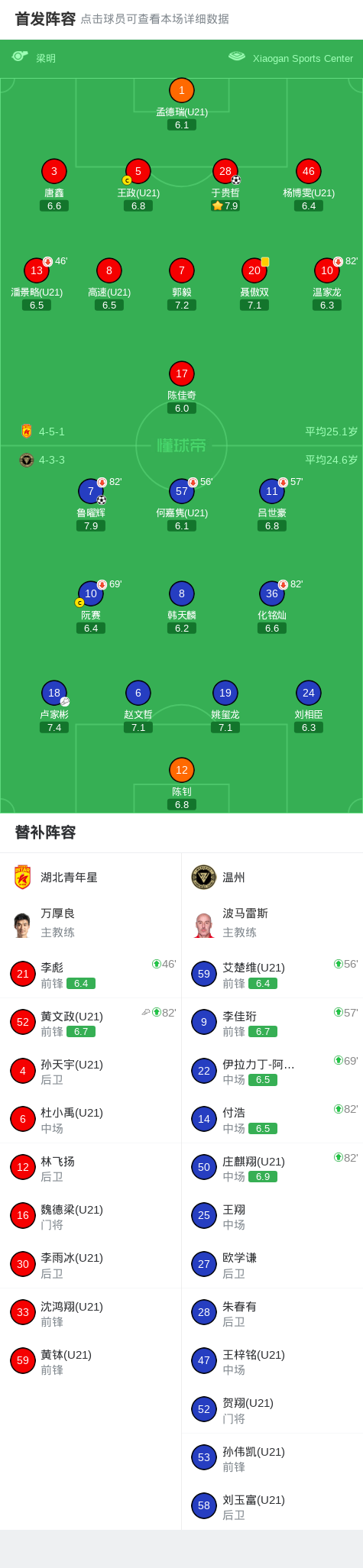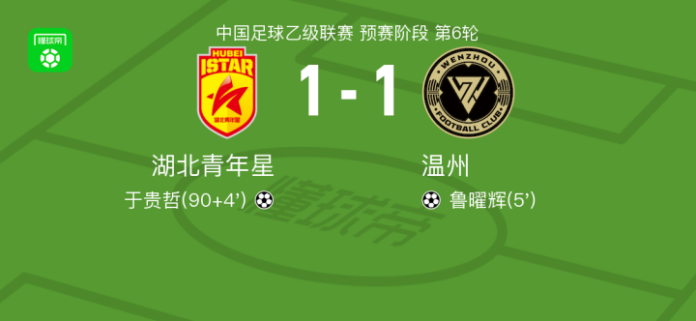 北京时间4月29日中国足球乙级联赛 预赛阶段 第6轮,湖北青年星主场对阵温州。湖北青年星于贵哲破门。温州鲁曜辉破门。最终比分湖北青年星 1–1 温州。