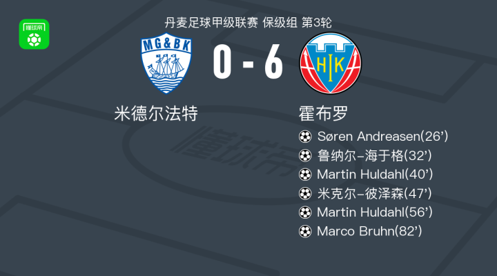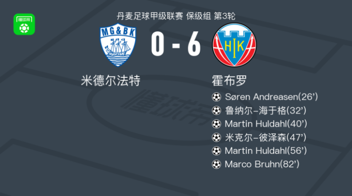 北京时间4月18日丹麦足球甲级联赛 保级组 第3轮,米德尔法特主场对阵霍布罗。霍布罗Søren Andreasen破门,鲁纳尔-海于格破门,Martin Huldahl梅开二度,米克尔-彼泽森破门,Marco Bruhn破门。最终比分米德尔法特 06 霍布罗。