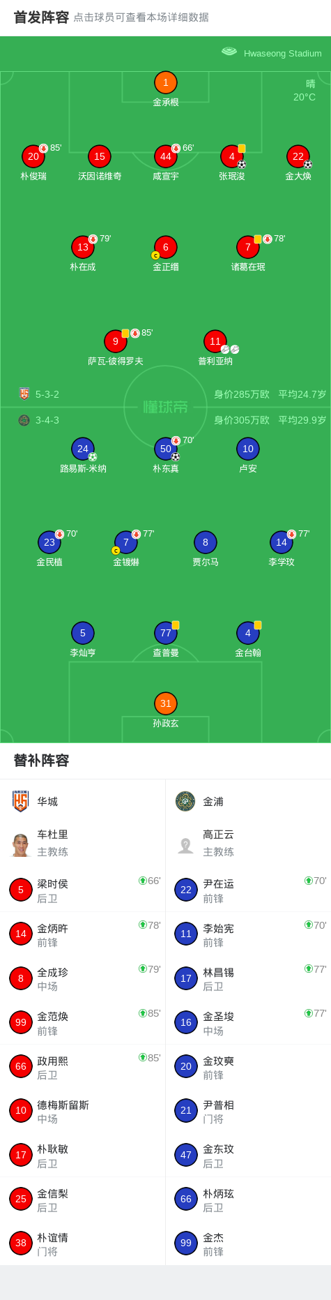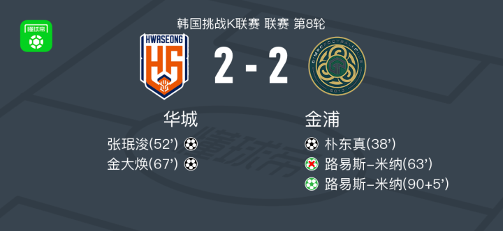 北京时间4月19日韩国挑战K联赛 联赛 第8轮,华城主场对阵金浦。华城张珉浚破门,金大焕破门。金浦朴东真破门,路易斯-米纳破门。最终比分华城 2–2 金浦。