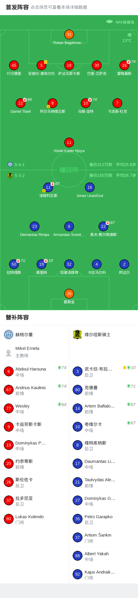 赫格尔曼0-0维尔纽斯骑士,双方互交白卷 足球资讯 发布时间: 2026年4月18日 阅读时间: 少于1 分钟 FacebookXPinterestWhatsApp 赫格尔曼0-0维尔纽斯骑士,双方互交白卷 北京时间4月18日立陶宛足球超级联赛 联赛 第9轮,赫格尔曼主场对阵维尔纽斯骑士。最终比分赫格尔曼 0–0 维尔纽斯骑士。 点击查看本场比赛详细数据>> 点击查看立陶超完整积分榜>> 球队阵容 技术统计 FacebookXPinterestWhatsApp 1823100https://1823100.com 红单推荐 015 西甲 巴萨vs塞尔塔 红单推荐 2026年4月22日 012 英超 伯恩茅斯vs利兹联 红单推荐 2026年4月22日 007 意杯 国际米兰vs科莫 红单推荐 2026年4月21日 005 西甲 毕尔巴鄂竞技vs奥萨苏纳 红单推荐 2026年4月21日 001 意甲 莱切vs佛罗伦萨 红单推荐 2026年4月20日 热门资讯 萨拉戈萨U19 0-0乌德山U19,双方握手言和 足球资讯 2026年4月12日 克莱普尔1-0巴拉卡斯体育,Aaron Caraballo一锤定音 足球资讯 2026年4月13日 萨拉赫安菲尔德英超进108球,联赛历史单座球场进球仅次于亨利 足球资讯 2026年4月12日 萨拉赫英超打入157粒非点球进球,追平阿圭罗列历史第五 足球资讯 2026年4月12日 郑大世:森保一执教风格很有人情味;日本队还得日本人执教 足球资讯 2026年4月23日