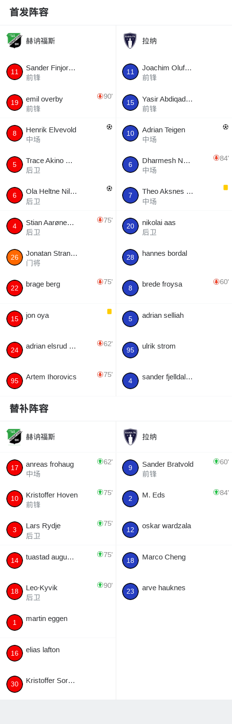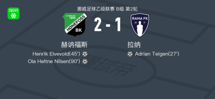 北京时间4月12日挪威足球乙级联赛 B组 第2轮,赫讷福斯主场对阵拉纳。赫讷福斯Henrik Elvevold破门,Ola Heltne Nilsen破门。拉纳Adrian Teigen破门。最终比分赫讷福斯 21 拉纳。