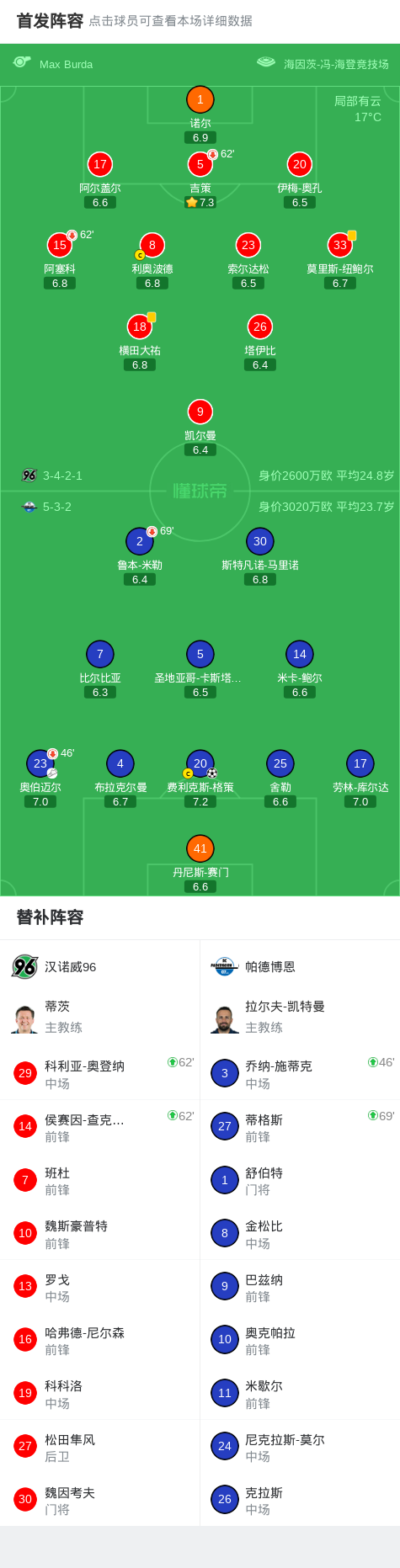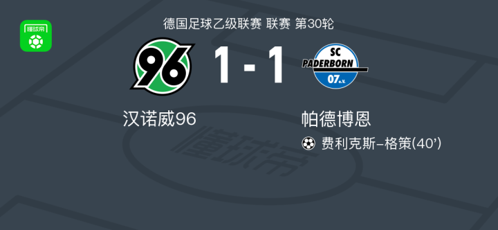 汉诺威96 1-1帕德博恩 足球资讯 发布时间: 2026年4月19日 阅读时间: 少于1 分钟 FacebookXPinterestWhatsApp 汉诺威96 1-1帕德博恩 北京时间4月19日德国足球乙级联赛 联赛 第30轮,汉诺威96主场对阵帕德博恩。帕德博恩费利克斯-格策破门。最终比分汉诺威96 1–1 帕德博恩。 点击查看本场比赛详细数据>> 点击查看德乙完整积分榜>> 精彩瞬间 第40分钟,帕德博恩球员奥伯迈尔助攻费利克斯-格策打入一球。 战报详情更新中…… 球队阵容 技术统计 FacebookXPinterestWhatsApp 1823100https://1823100.com 红单推荐 015 西甲 巴萨vs塞尔塔 红单推荐 2026年4月22日 012 英超 伯恩茅斯vs利兹联 红单推荐 2026年4月22日 007 意杯 国际米兰vs科莫 红单推荐 2026年4月21日 005 西甲 毕尔巴鄂竞技vs奥萨苏纳 红单推荐 2026年4月21日 001 意甲 莱切vs佛罗伦萨 红单推荐 2026年4月20日 热门资讯 萨拉戈萨U19 0-0乌德山U19,双方握手言和 足球资讯 2026年4月12日 007 英冠 伊普斯维奇vs米德尔斯堡 红单推荐 2026年4月19日 克莱普尔1-0巴拉卡斯体育,Aaron Caraballo一锤定音 足球资讯 2026年4月13日 萨拉赫安菲尔德英超进108球,联赛历史单座球场进球仅次于亨利 足球资讯 2026年4月12日 萨拉赫英超打入157粒非点球进球,追平阿圭罗列历史第五 足球资讯 2026年4月12日