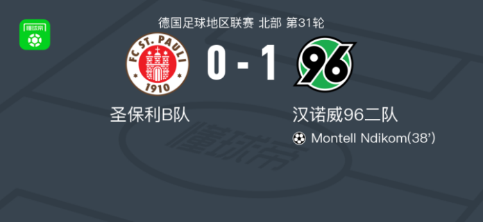 汉诺威96业余队1-0圣保利B队,Montell Ndikom一剑封喉 足球资讯 发布时间: 2026年4月25日 阅读时间: 少于1 分钟 FacebookXPinterestWhatsApp 汉诺威96业余队1-0圣保利B队,Montell Ndikom一剑封喉 北京时间4月25日德国足球地区联赛 北部 第31轮,圣保利B队主场对阵汉诺威96二队。汉诺威96二队Montell Ndikom破门。最终比分圣保利B队 0–1 汉诺威96业余队。 点击查看本场比赛详细数据>> 精彩瞬间 第38分钟,汉诺威96二队球员Montell Ndikom打入一球。 FacebookXPinterestWhatsApp 1823100https://1823100.com 红单推荐 021 西甲 奥萨苏纳vs塞维利亚 红单推荐 2026年4月26日 013 英足总杯 切尔西(中)vs利兹联 红单推荐 2026年4月26日 023 英超 阿森纳vs纽卡斯尔 红单推荐 2026年4月25日 016 英超 狼队vs热刺 红单推荐 2026年4月25日 013 英超 桑德兰vs诺丁汉 红单推荐 2026年4月24日 热门资讯 阿贾克斯女足0-0费耶诺德女足,秋色平分 足球资讯 2026年4月26日 阿拉德纺织厂0-0康斯坦察灯塔,平分秋色 足球资讯 2026年4月26日 官方:贺希宁当选本赛季CBA常规赛MVP 篮球资讯 2026年4月26日 马竞官方:巴里奥斯左大腿肌肉受伤,回归时间取决于恢复情况 足球资讯 2026年4月26日 官方:怀特塞德当选本赛季CBA常规赛最佳防守球员 篮球资讯 2026年4月26日