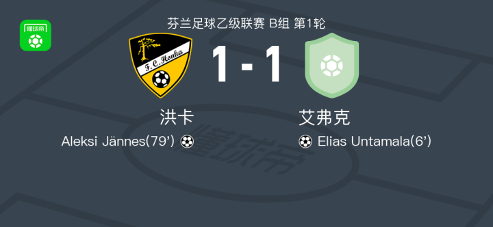 北京时间4月18日芬兰足球乙级联赛 B组 第1轮,洪卡主场对阵艾弗克。洪卡Aleksi Jännes破门。艾弗克Elias Untamala破门。最终比分洪卡 1–1 艾弗克。