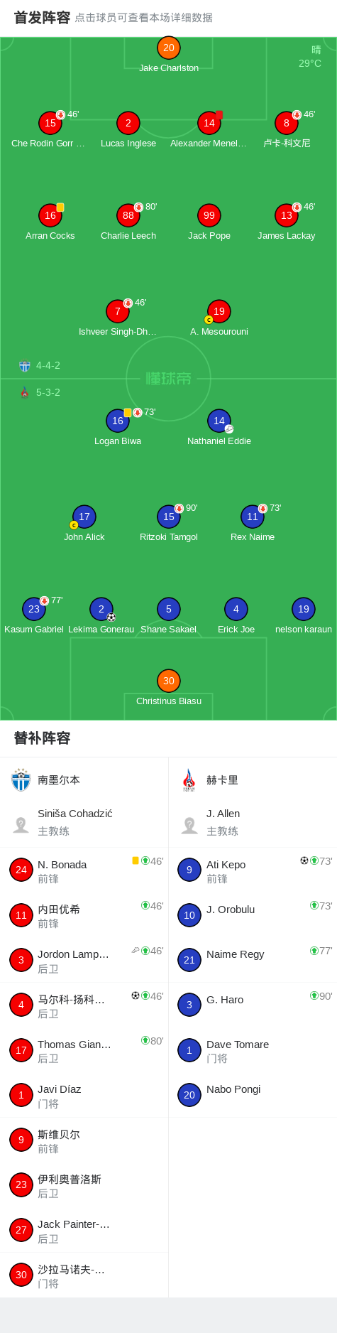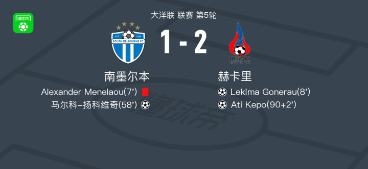 北京时间4月18日大洋联 联赛 第5轮,南墨尔本对阵赫卡里。南墨尔本马尔科-扬科维奇破门。赫卡里Lekima Gonerau破门,Ati Kepo破门。最终比分南墨尔本 1–2 赫卡里。