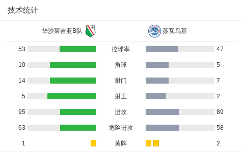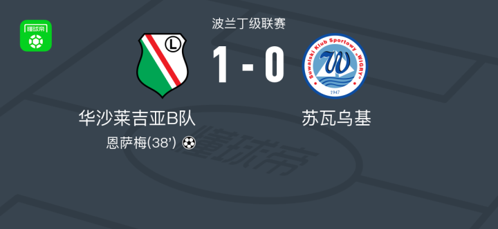 华沙莱吉亚B队1-0苏瓦乌基,恩萨梅一锤定音 足球资讯 发布时间: 2026年4月19日 阅读时间: 少于1 分钟 FacebookXPinterestWhatsApp 华沙莱吉亚B队1-0苏瓦乌基,恩萨梅一锤定音 北京时间4月19日波兰丁级联赛,华沙莱吉亚B队对阵苏瓦乌基。华沙莱吉亚B队恩萨梅破门。最终比分华沙莱吉亚B队 1–0 苏瓦乌基。 点击查看本场比赛详细数据>> 精彩瞬间 第38分钟,华沙莱吉亚B队球员恩萨梅打入一球。 技术统计 FacebookXPinterestWhatsApp 1823100https://1823100.com 红单推荐 005 西甲 巴列卡诺vs西班牙人 红单推荐 2026年4月23日 003 西甲 莱万特vs塞维利亚 红单推荐 2026年4月23日 015 西甲 巴萨vs塞尔塔 红单推荐 2026年4月22日 012 英超 伯恩茅斯vs利兹联 红单推荐 2026年4月22日 007 意杯 国际米兰vs科莫 红单推荐 2026年4月21日 热门资讯 萨拉戈萨U19 0-0乌德山U19,双方握手言和 足球资讯 2026年4月12日 019 英超 曼城vs阿森纳 红单推荐 2026年4月19日 007 英冠 伊普斯维奇vs米德尔斯堡 红单推荐 2026年4月19日 萨拉赫安菲尔德英超进108球,联赛历史单座球场进球仅次于亨利 足球资讯 2026年4月12日 主裁判琼斯谈穆阿尼倒地未获点:桑德兰后卫明显先触球 足球资讯 2026年4月12日