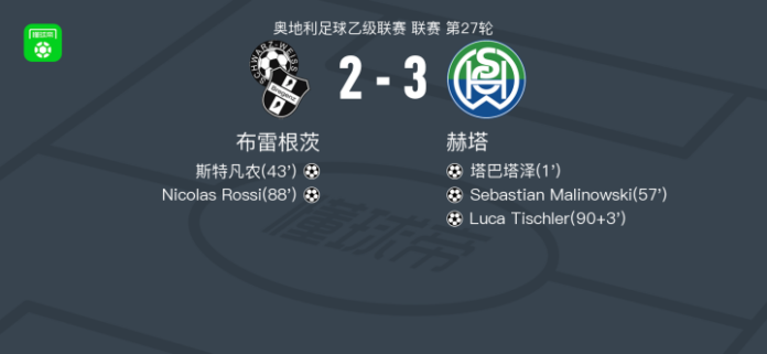 北京时间4月25日奥地利足球乙级联赛 联赛 第27轮,布雷根茨主场对阵赫塔。布雷根茨斯特凡农破门,Nicolas Rossi破门。赫塔塔巴塔泽破门,Sebastian Malinowski破门,Luca Tischler破门。最终比分布雷根茨 2–3 赫塔。