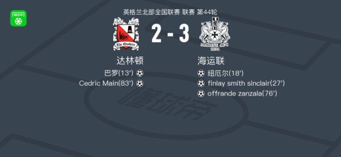 北京时间4月11日英格兰北部全国联赛 联赛 第44轮,达林顿主场对阵海运联。达林顿巴罗破门,Cedric Main破门。海运联纽厄尔破门,finlay smith sinclair破门,offrande zanzala破门。最终比分达林顿 23 海运联。