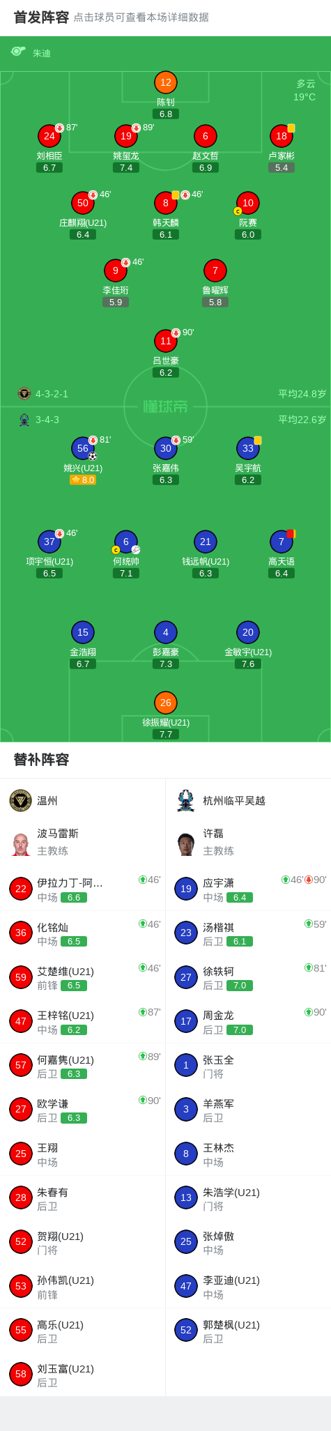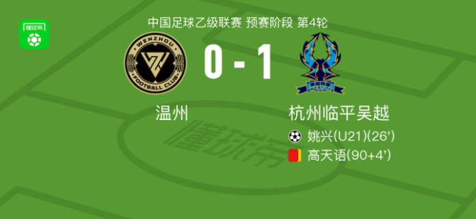 杭州临平吴越1-0温州,姚兴一击制胜 足球资讯 发布时间: 2026年4月15日 阅读时间: 少于1 分钟 FacebookXPinterestWhatsApp 杭州临平吴越1-0温州,姚兴一击制胜 北京时间4月15日中国足球乙级联赛 预赛阶段 第4轮,温州主场对阵杭州临平吴越。杭州临平吴越姚兴破门。最终比分温州 0–1 杭州临平吴越。 点击查看本场比赛详细数据>> 点击查看中乙完整积分榜>> 精彩瞬间 第26分钟,杭州临平吴越球员何统帅助攻姚兴打入一球。 下半场补时第4分钟,杭州临平吴越球队高天语吃到第二张黄牌。 球队阵容 FacebookXPinterestWhatsApp 1823100https://1823100.com 红单推荐 013 英超 桑德兰vs诺丁汉 红单推荐 2026年4月24日 014 西甲 贝蒂斯vs皇马 红单推荐 2026年4月24日 005 西甲 巴列卡诺vs西班牙人 红单推荐 2026年4月23日 003 西甲 莱万特vs塞维利亚 红单推荐 2026年4月23日 015 西甲 巴萨vs塞尔塔 红单推荐 2026年4月22日 热门资讯 约基奇第198次三双!掘金大胜灰熊豪取10连胜 穆雷26+7+5 篮球资讯 2026年4月9日 三人20+!火箭21分逆转太阳7连胜 KD24分阿门22+11+8 篮球资讯 2026年4月8日 002 欧协联 巴列卡诺vs雅典AEK 红单推荐 2026年4月9日 萨拉戈萨U19 0-0乌德山U19,双方握手言和 足球资讯 2026年4月12日 004 欧冠 巴萨vs马竞 红单推荐 2026年4月8日