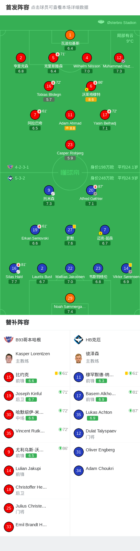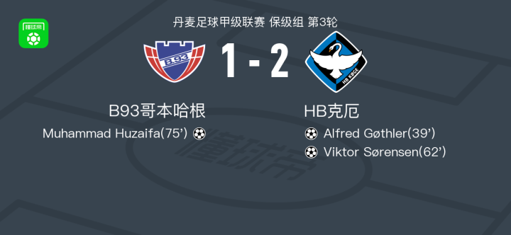 北京时间4月18日丹麦足球甲级联赛 保级组 第3轮,B93哥本哈根主场对阵HB克厄。B93哥本哈根Muhammad Huzaifa破门。HB克厄Alfred Gøthler破门,Viktor Sørensen破门。最终比分B93哥本哈根 12 HB克厄。