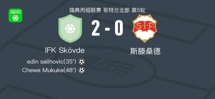 北京时间4月25日瑞典丙组联赛 哥特兰北部 第5轮,IFK Skövde主场对阵斯滕桑德。IFK Skövdeedin salihovic破门,Chewe Mukuka破门。最终比分IFK Skövde 2–0 斯滕桑德。