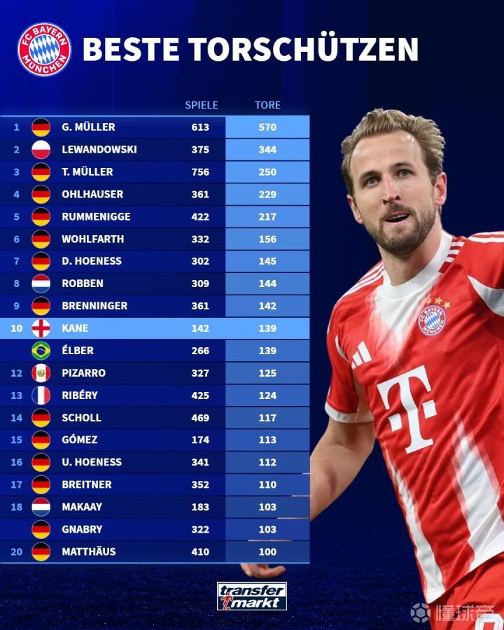 加盟尚未满3个赛季,凯恩已经跻身拜仁队史射手榜第10名